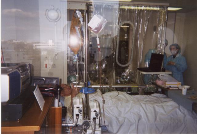 ![]() 2002年9月 「急性リンパ性白血病」と診断された日 即行入院(日大板橋病院) すぐにCV確保 後ろのビニールはアイソレーター用 まだ自分の病気を理解していないShin |
